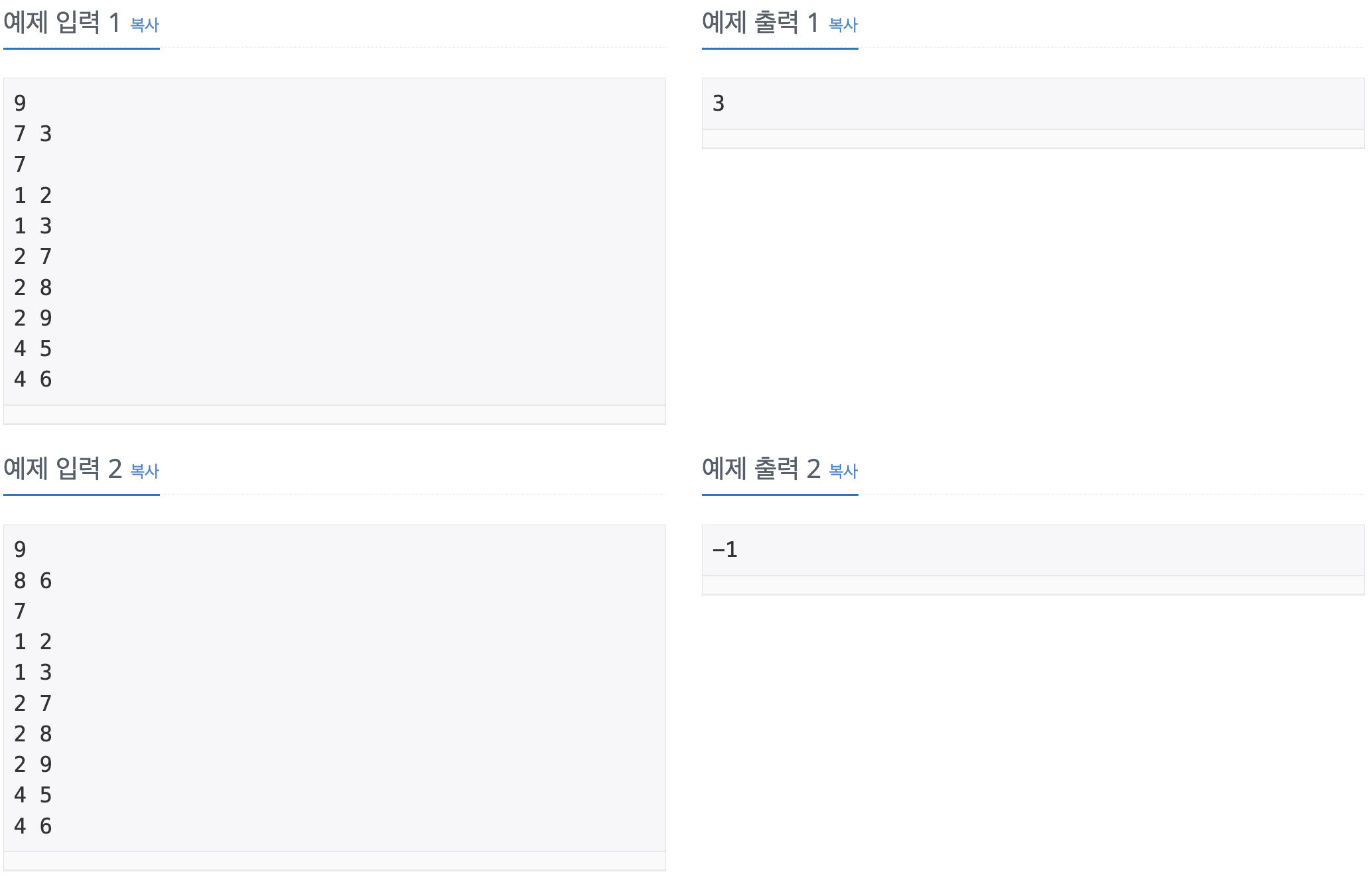 사람들은 1, 2, 3, …, n (1 ≤ n ≤ 100)의 연속된 번호로 각각 표시된다. 입력 파일의 첫째 줄에는 전체 사람의 수 n이 주어지고, 둘째 줄에는 촌수를 계산해야 하는 서로 다른 두 사람의 번호가 주어